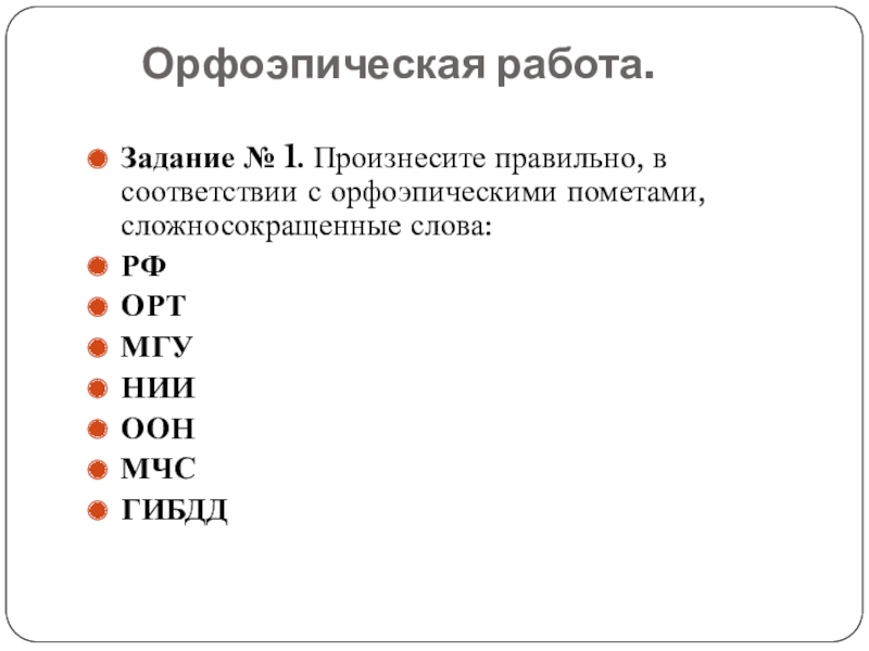 Задание № 1. Произнесите правильно, в соответствии с орфоэпическими пометами,
