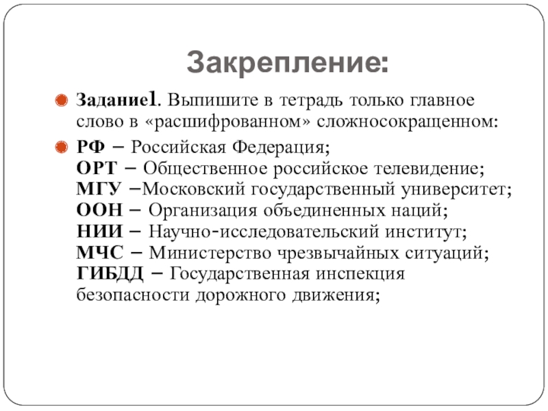 Задание1. Выпишите в тетрадь только главное слово в «расшифрованном» сложносокращенном: