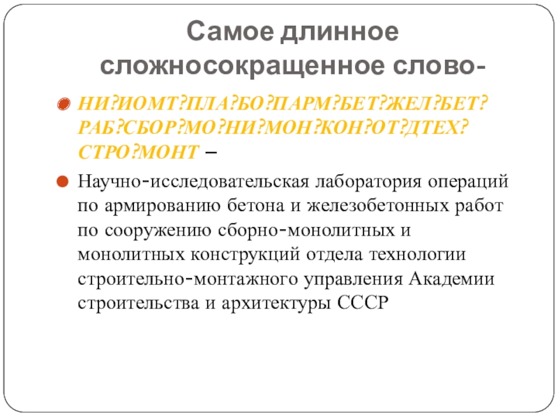 НИ?ИОМТ?ПЛА?БО?ПАРМ?БЕТ?ЖЕЛ?БЕТ?РАБ?СБОР?МО?НИ?МОН?КОН?ОТ?ДТЕХ?СТРО?МОНТ –
