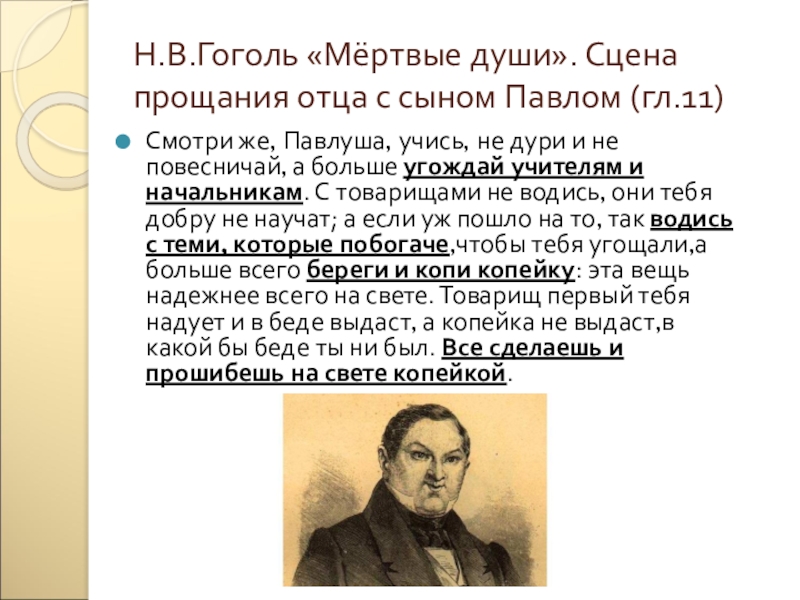 Павлуша, учись, не дури и не повесничай, а больше угождай учителям и начальникам. С товарищами не водись, они тебя добру не научат; а если уж пошло на то, так водись с теми, которые побогаче,чтобы тебя угощали,а больше всего береги и копи копейку: эта вещь надежнее всего на свете. Товарищ первый тебя надует и в беде выдаст, а копейка не выдаст,в какой бы беде ты ни был. Все сделаешь и прошибешь на свете копейкой.