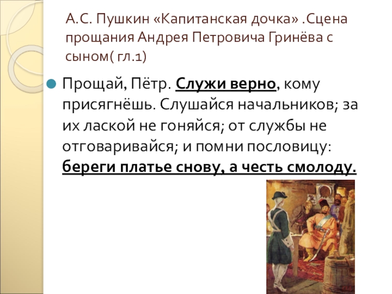 Слайд 7А.С. Пушкин «Капитанская дочка» .Сцена прощания Андрея Петровича Гринёва с сыном(