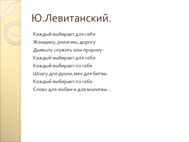 Находит смысл службы в единстве с народом, прощении врагов,; несёт любовь земную и любовь к Богу. «В полку его называли наш князь, им гордились и его любили».