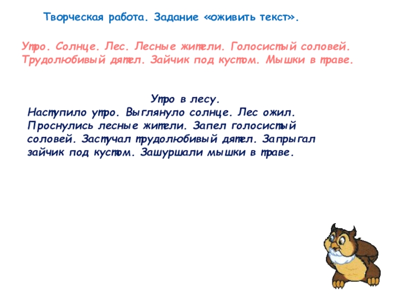 Наступило утро. Выглянуло солнце. Лес ожил. Проснулись лесные жители. Запел голосистый соловей. Застучал трудолюбивый дятел. Запрыгал зайчик под кустом. Зашуршали мышки в траве.