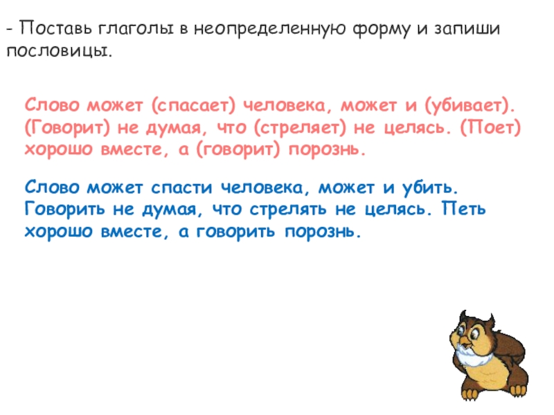 - Поставь глаголы в неопределенную форму и запиши пословицы.
