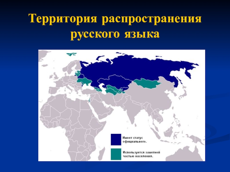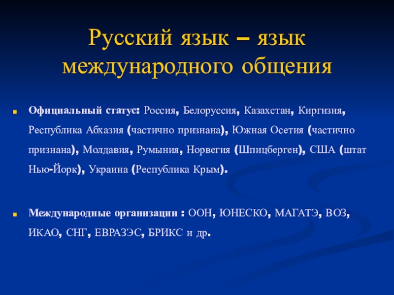 Русский язык – язык международного общения Официальный статус: Россия, Белоруссия, Казахстан, Киргизия, Республика Абхазия (частично признана), Южная Осетия