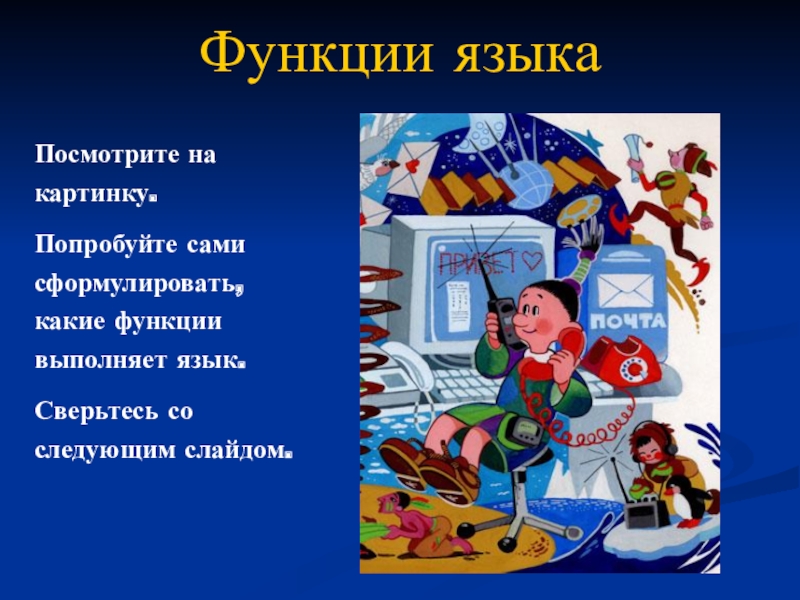 Функции языкаПосмотрите на картинку.Попробуйте сами сформулировать, какие функции выполняет язык. Сверьтесь со следующим слайдом.