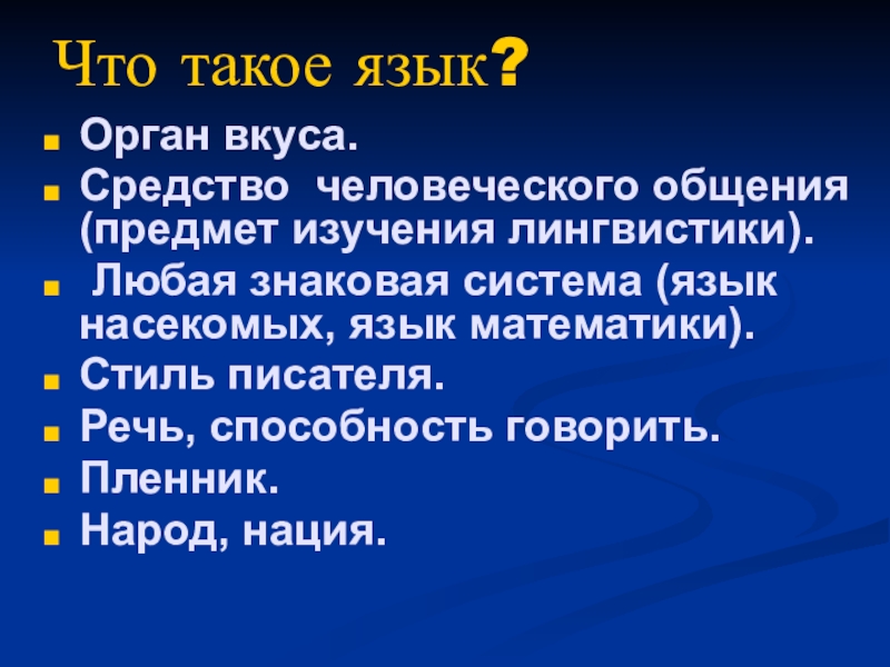 Что такое язык?Орган вкуса.Средство человеческого общения (предмет изучения лингвистики). Любая знаковая система (язык насекомых, язык математики). Стиль