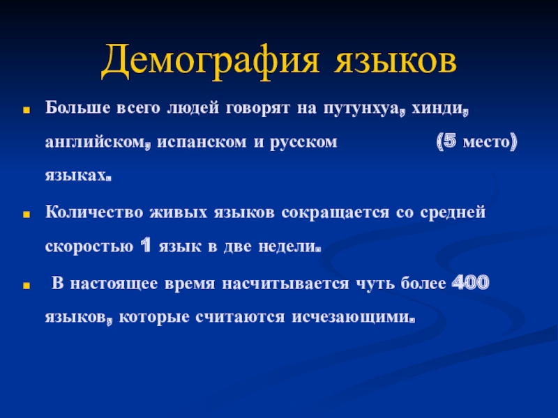 Демография языковБольше всего людей говорят на путунхуа, хинди, английском, испанском и русском