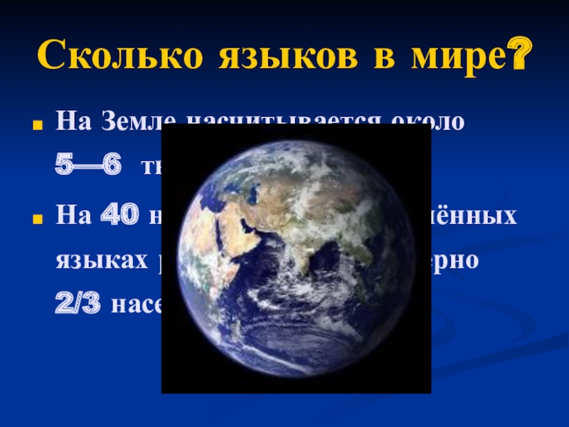 Сколько языков в мире?На Земле насчитывается около 5—6 тысяч языков. На 40 наиболее распространённых языках разговаривает примерно