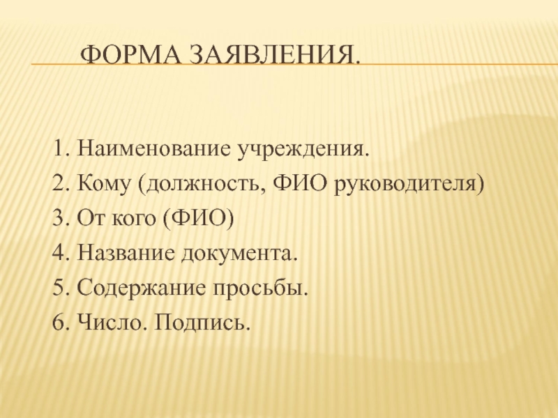 ФОРМА ЗАЯВЛЕНИЯ.	1. Наименование учреждения.	2. Кому (должность, ФИО руководителя)	3. От кого (ФИО)	4. Название документа.	5. Содержание просьбы.	6. Число. Подпись.