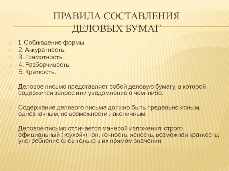 ПРАВИЛА СОСТАВЛЕНИЯ  ДЕЛОВЫХ БУМАГ1. Соблюдение формы.2. Аккуратность.3. Грамотность.4. Разборчивость.5. Краткость.Деловое письмо представляет собой деловую бумагу, в