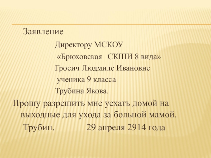 Заявление 				Директору МСКОУ				 «Брюховская 	СКШИ 8 вида» 				Гросич Людмиле Ивановне				 ученика 9 класса 				Трубина Якова.Прошу разрешить мне