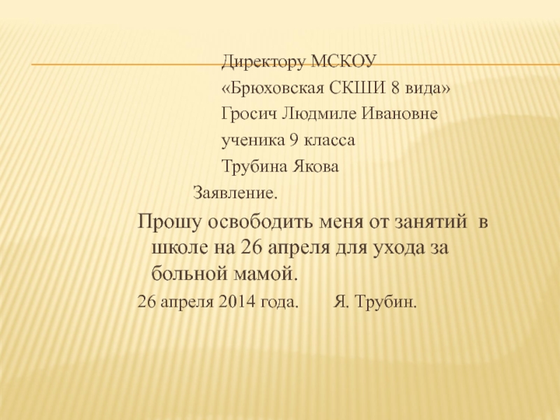 Директору МСКОУ 			«Брюховская СКШИ 8 вида»			Гросич Людмиле Ивановне			ученика 9 класса			Трубина Якова		Заявление.Прошу освободить меня от занятий в школе