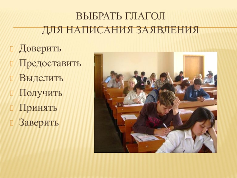 ВЫБРАТЬ ГЛАГОЛ  ДЛЯ НАПИСАНИЯ ЗАЯВЛЕНИЯ ДоверитьПредоставитьВыделитьПолучитьПринятьЗаверить
