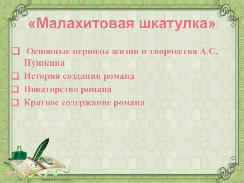 «Малахитовая шкатулка» Основные периоды жизни и творчества А.С.ПушкинаИстория создания романаНоваторство романаКраткое содержание романа
