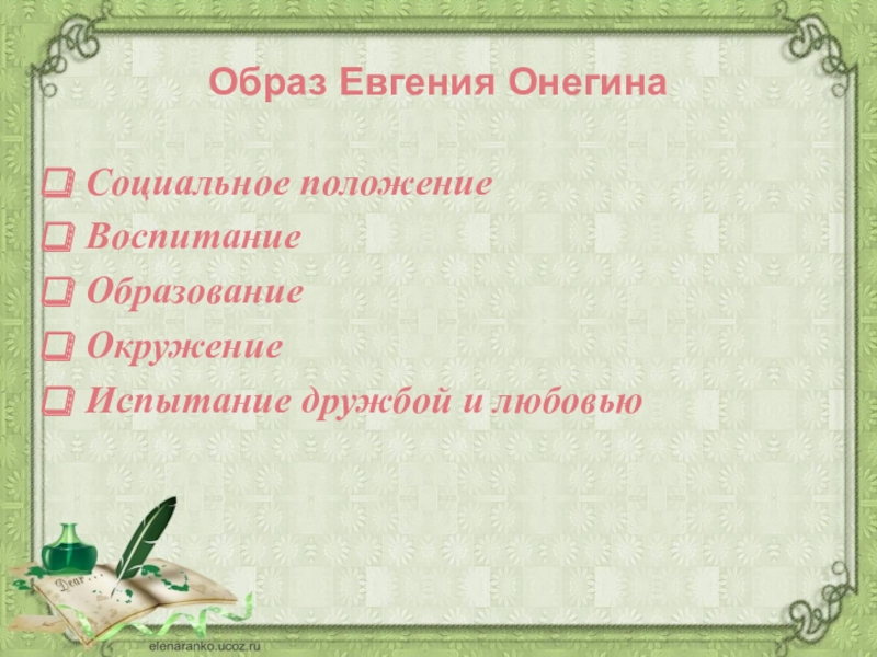 Образ Евгения ОнегинаСоциальное положениеВоспитаниеОбразованиеОкружениеИспытание дружбой и любовью