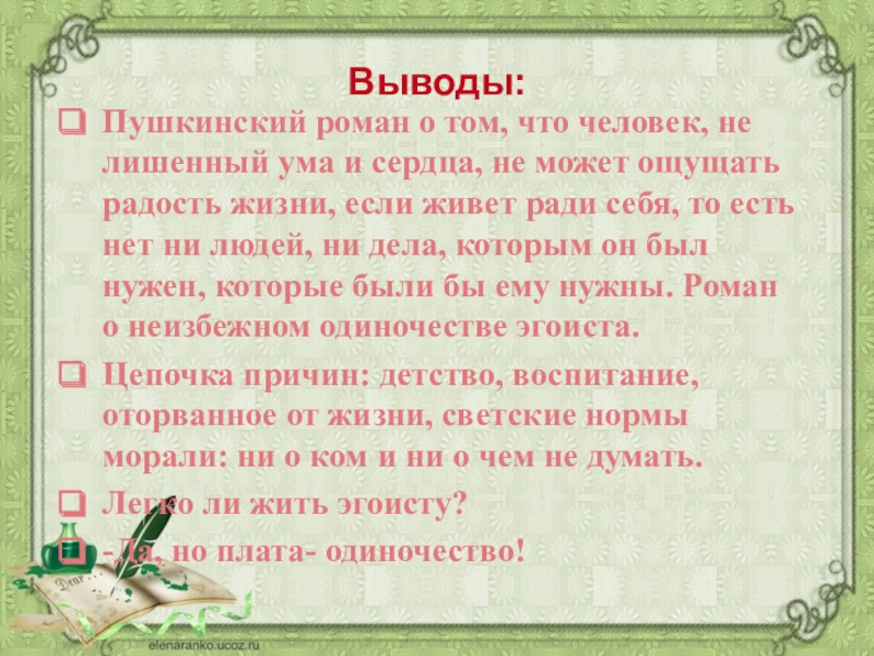 Выводы:Пушкинский роман о том, что человек, не лишенный ума и сердца, не может ощущать радость жизни, если
