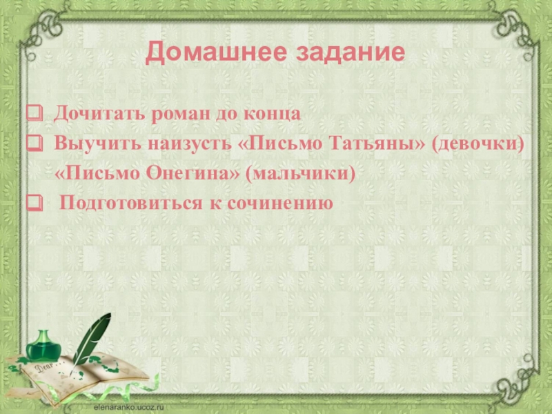 Домашнее заданиеДочитать роман до концаВыучить наизусть «Письмо Татьяны» (девочки)  «Письмо Онегина» (мальчики) Подготовиться к сочинению
