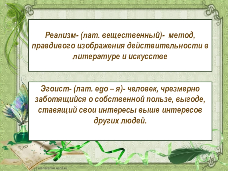 Реализм- (лат. вещественный)- метод, правдивого изображения действительности в литературе и искусствеЭгоист- (лат. еgo – я)- человек, чрезмерно