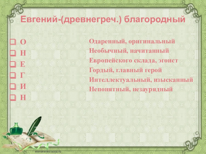 Евгений-(древнегреч.) благородныйОНЕГИНОдаренный, оригинальныйНеобычный, начитанныйЕвропейского склада, эгоистГордый, главный геройИнтеллектуальный, изысканныйНепонятный, незаурядный