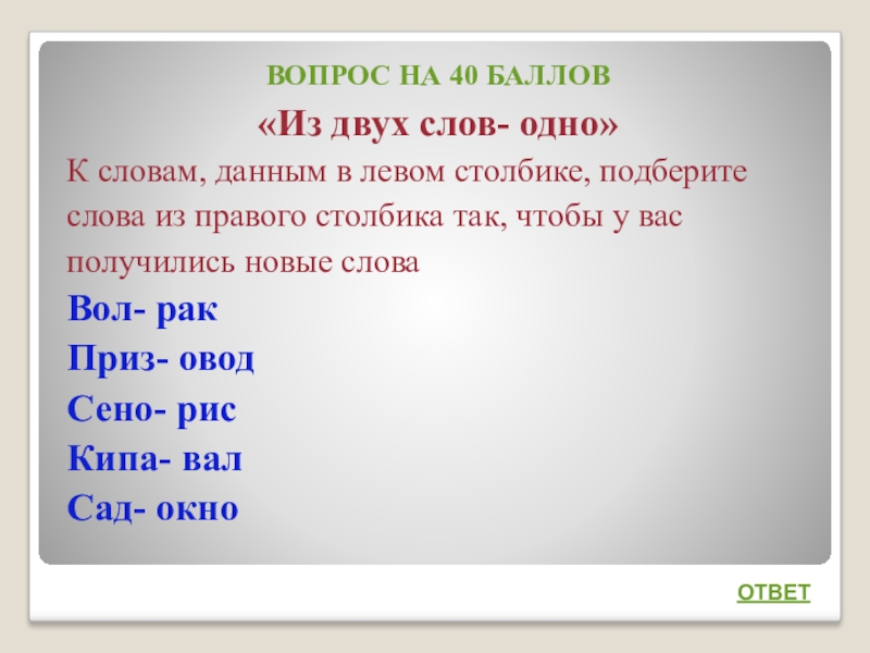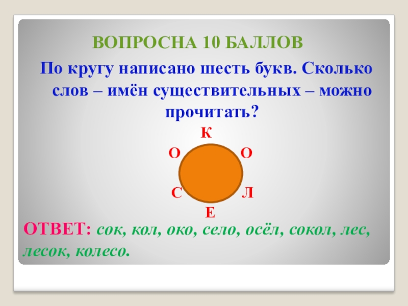 ОТВЕТ: сок, кол, око, село, осёл, сокол, лес, лесок, колесо.