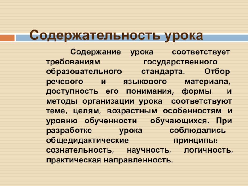 речевого и языкового материала, доступность его понимания, формы и методы организации урока соответствуют теме, целям, возрастным особенностям и уровню обученности обучающихся. При разработке урока соблюдались общедидактические принципы: сознательность, научность, логичность, практическая направленность.