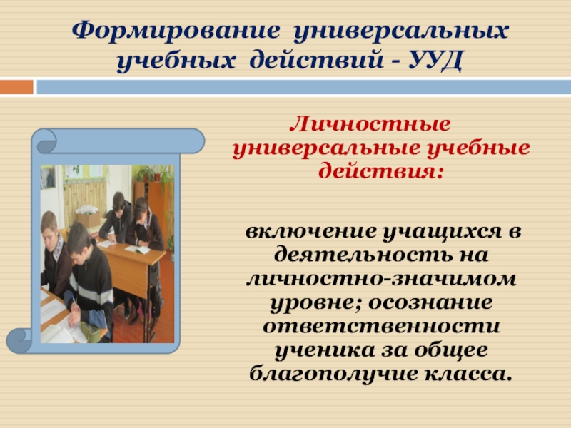 учащихся в деятельность на личностно-значимом уровне; осознание ответственности ученика за общее благополучие класса.