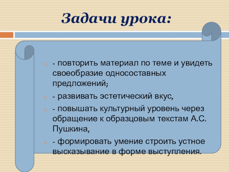 закрепить умение различать виды односоставных предложений; использовать односоставные предложения в речи; определять роль односоставных предложений в тексте, учиться раскрывать авторский замысел ;