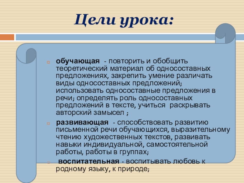 обучающая - повторить и обобщить теоретический материал об односоставных предложениях,