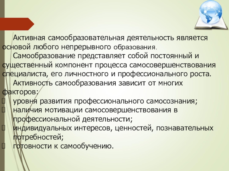 Слайд 2Активная самообразовательная деятельность является основой любого непрерывного образования.