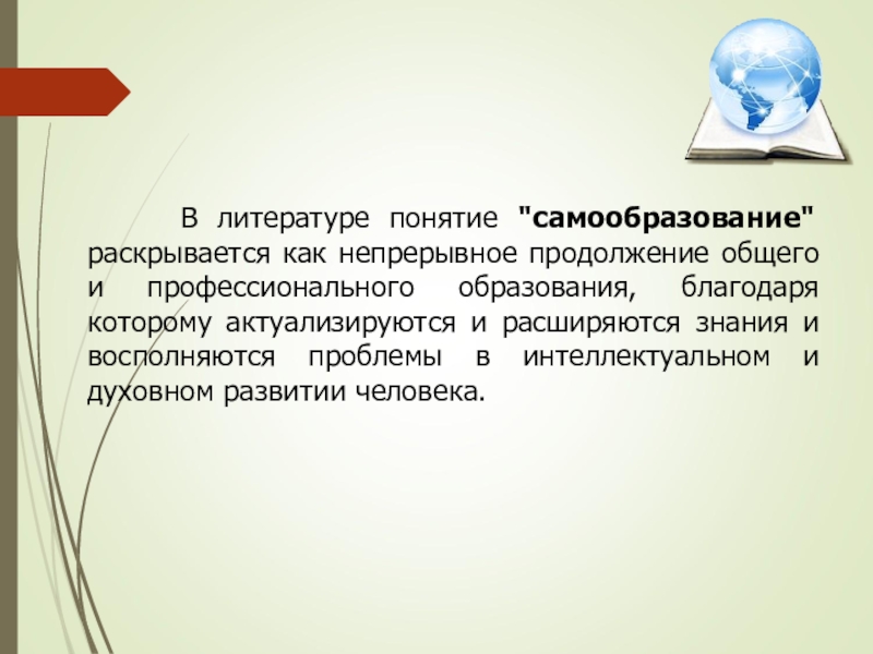 Слайд 3 В литературе понятие "самообразование" раскрывается как непрерывное продолжение