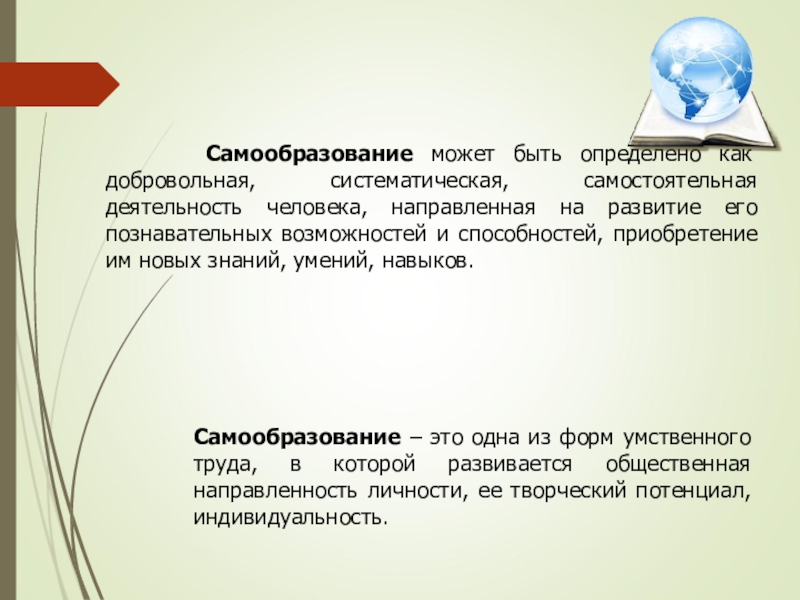 Самообразование – это одна из форм умственного труда, в которой развивается общественная направленность личности, ее творческий потенциал, индивидуальность.
