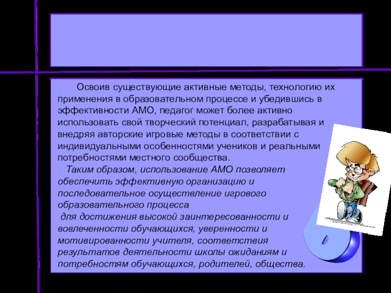 в образовательном процессе и убедившись в эффективности АМО, педагог может более активно использовать свой творческий потенциал, разрабатывая и внедряя авторские игровые методы в соответствии с индивидуальными особенностями учеников и реальными потребностями местного сообщества.