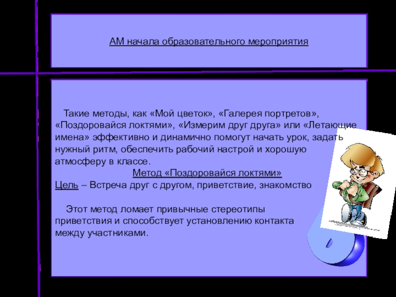 портретов», «Поздоровайся локтями», «Измерим друг друга» или «Летающие имена» эффективно и динамично помогут начать урок, задать нужный ритм, обеспечить рабочий настрой и хорошую атмосферу в классе.