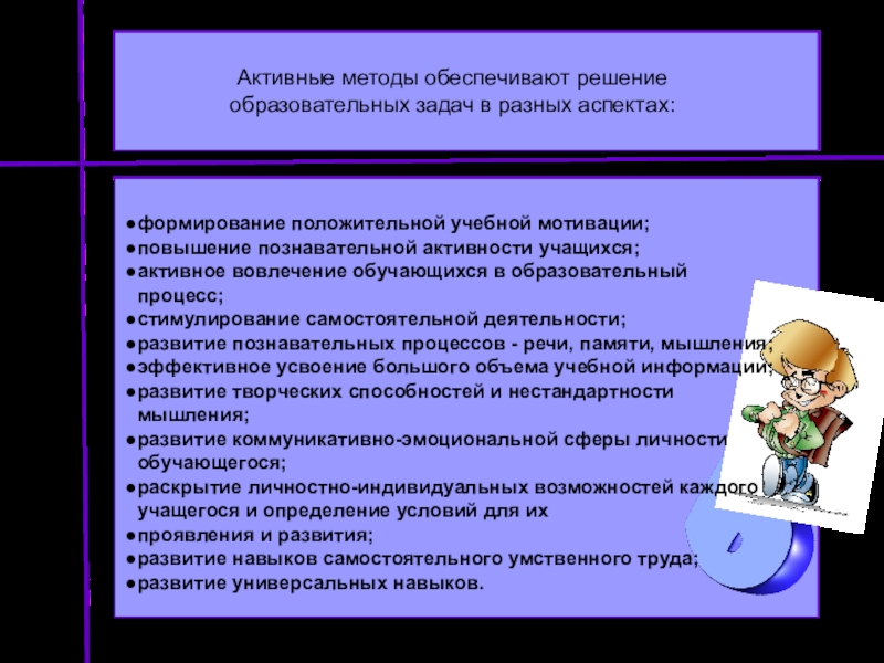 Активные методы обеспечивают решение образовательных задач в разных аспектах: