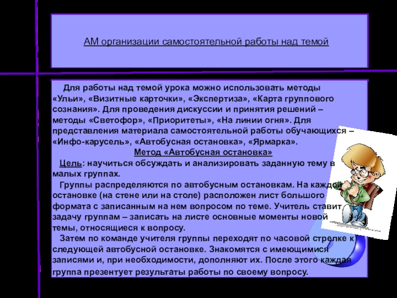 урока можно использовать методы «Ульи», «Визитные карточки», «Экспертиза», «Карта группового сознания». Для проведения дискуссии и принятия решений – методы «Cветофор», «Приоритеты», «На линии огня». Для представления материала самостоятельной работы обучающихся – «Инфо-карусель», «Автобусная остановка», «Ярмарка».