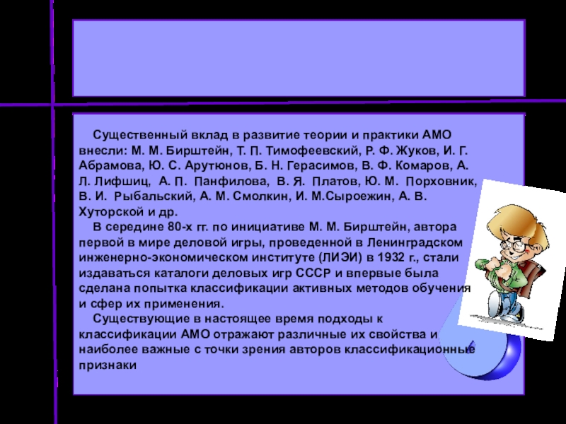 В середине 80-х гг. по инициативе М. М. Бирштейн, автора первой в мире деловой игры, проведенной в Ленинградском инженерно-экономическом институте (ЛИЭИ) в 1932 г., стали издаваться каталоги деловых игр СССР и впервые была сделана попытка классификации активных методов обучения и сфер их применения.