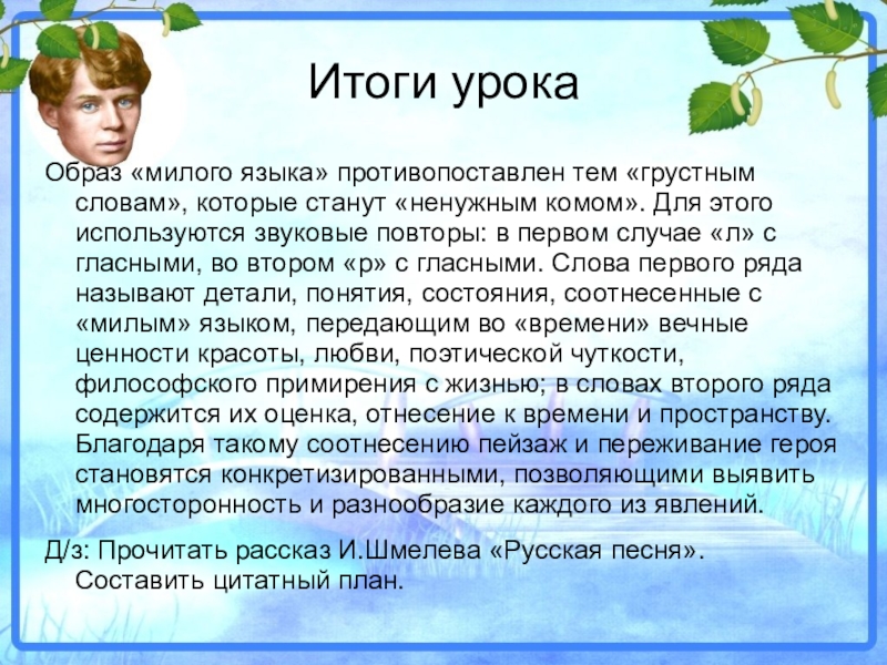 Д/з: Прочитать рассказ И.Шмелева «Русская песня». Составить цитатный план.