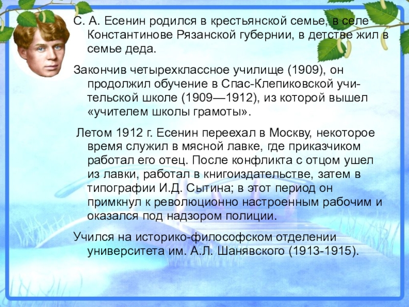 Слайд 3С. А. Есенин родился в крестьянской семье, в селе Константинове Рязанской