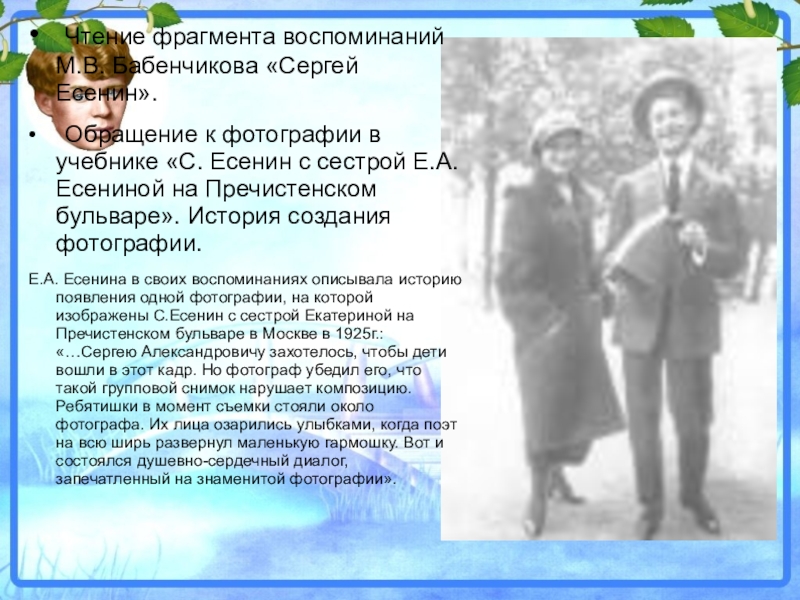 «С. Есенин с сестрой Е.А. Есениной на Пречистенском бульваре». История создания фотографии.