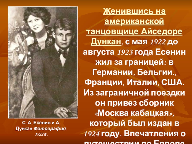 С. А. Есенин и А. Дункан Фотография. 1922 г.