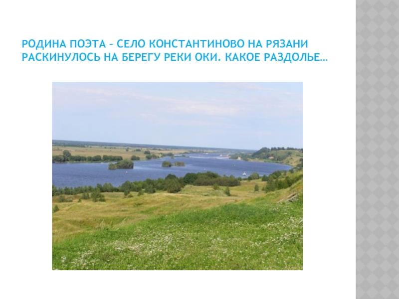 Родина поэта – село Константиново на Рязани    раскинулось на берегу реки Оки. Какое раздолье…