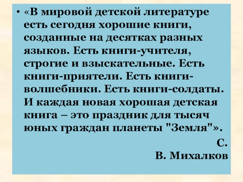 Сергей Владимирович говорил: «Я стараюсь работать в разных жанрах: пишу стихи, пьесы, сценарии для взрослых и детей, песни, сатиру, статьи, заметки.… Я считаю, что работа в разных жанрах взаимно обогащает их».