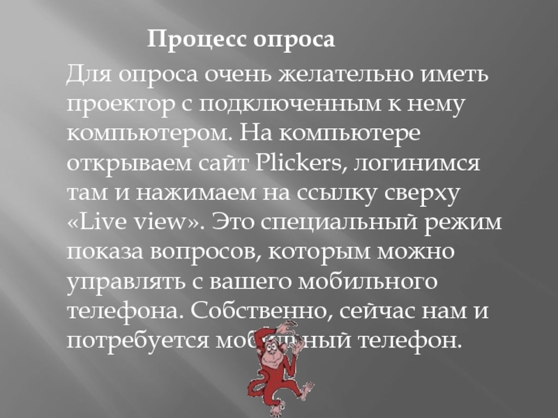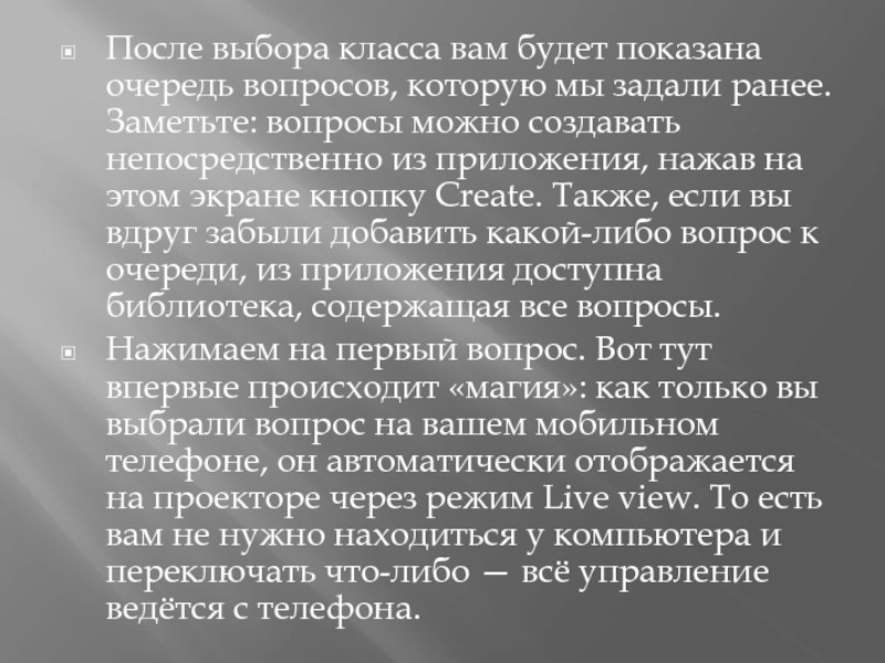 Нажимаем на первый вопрос. Вот тут впервые происходит «магия»: как только вы выбрали вопрос на вашем мобильном телефоне, он автоматически отображается на проекторе через режим Live view. То есть вам не нужно находиться у компьютера и переключать что-либо — всё управление ведётся с телефона.