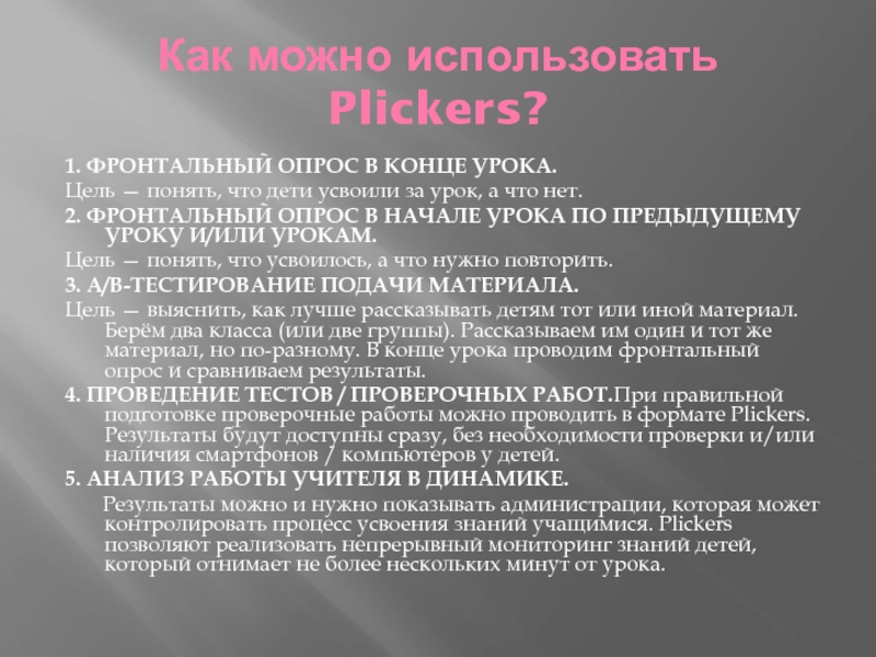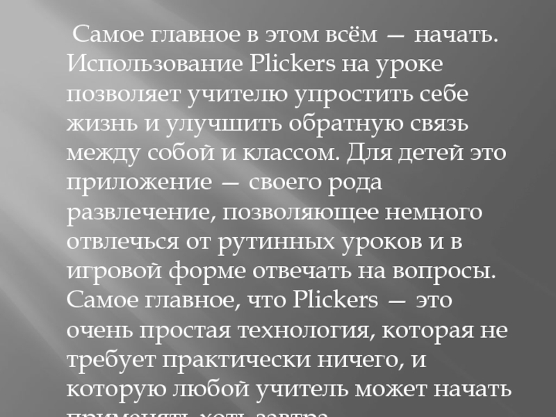 Plickers на уроке позволяет учителю упростить себе жизнь и улучшить обратную связь между собой и классом. Для детей это приложение — своего рода развлечение, позволяющее немного отвлечься от рутинных уроков и в игровой форме отвечать на вопросы. Самое главное, что Plickers — это очень простая технология, которая не требует практически ничего, и которую любой учитель может начать применять хоть завтра.
