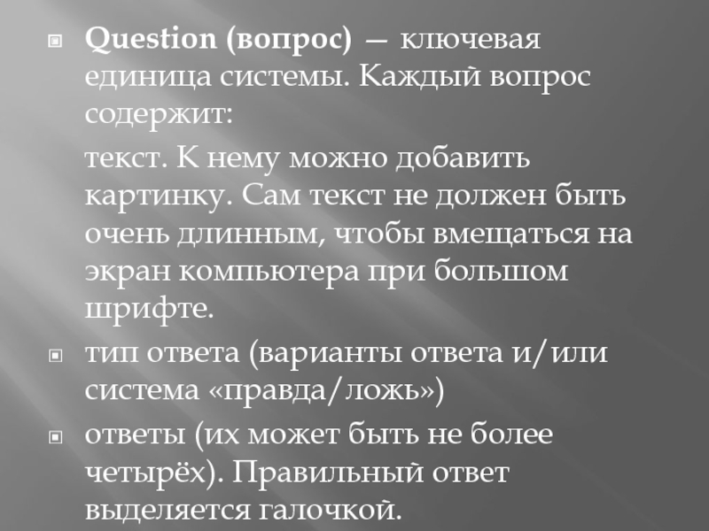 Слайд 7Question (вопрос) — ключевая единица системы. Каждый вопрос содержит: