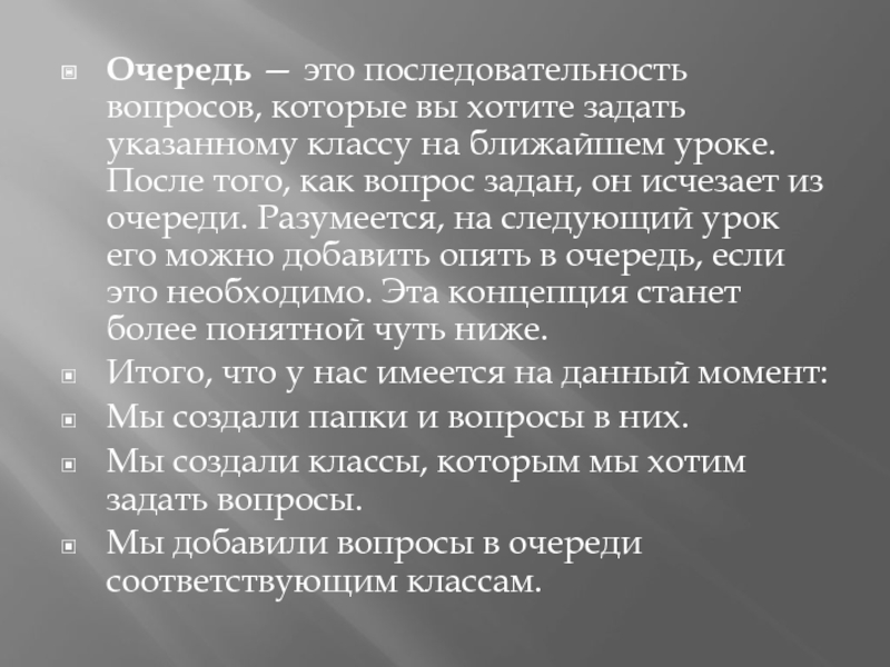 Слайд 12Очередь — это последовательность вопросов, которые вы хотите задать указанному классу на