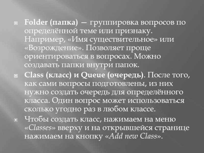существительное» или «Возрождение». Позволяет проще ориентироваться в вопросах. Можно создавать папки внутри папок.