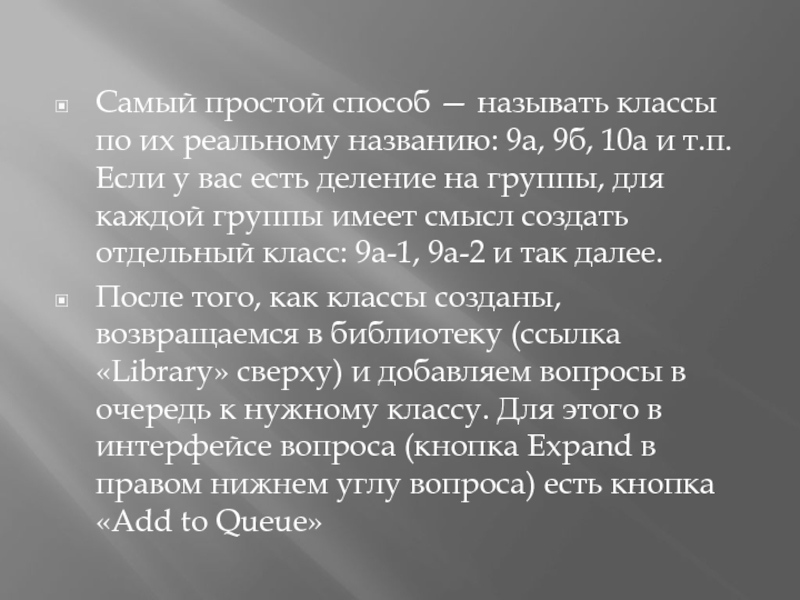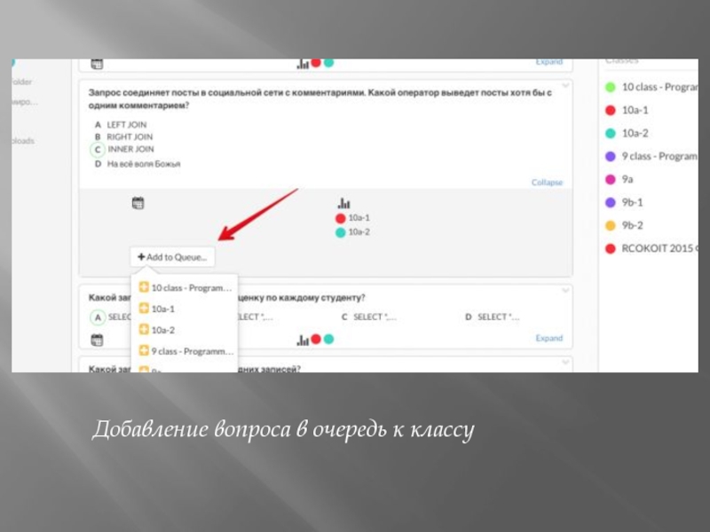 После того, как классы созданы, возвращаемся в библиотеку (ссылка «Library» сверху) и добавляем вопросы в очередь к нужному классу. Для этого в интерфейсе вопроса (кнопка Expand в правом нижнем углу вопроса) есть кнопка «Add to Queue»