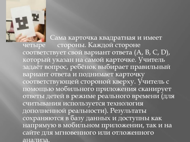 и имеет четыре стороны. Каждой стороне соответствует свой вариант ответа (A, B, C, D), который указан на самой карточке. Учитель задаёт вопрос, ребёнок выбирает правильный вариант ответа и поднимает карточку соответствующей стороной кверху. Учитель с помощью мобильного приложения сканирует ответы детей в режиме реального времени (для считывания используется технология дополненной реальности). Результаты сохраняются в базу данных и доступны как напрямую в мобильном приложении, так и на сайте для мгновенного или отложенного анализа.